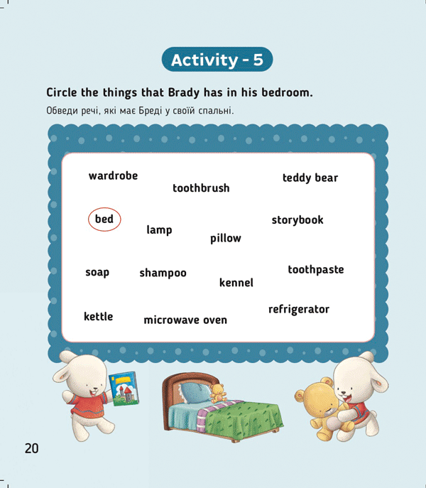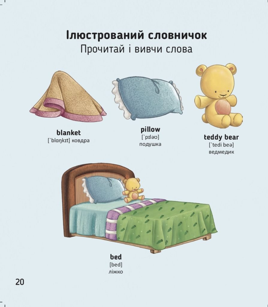 Саме це є основою вивчення слів у книжечках про кролика Бреді. Слова запам’ятовуються через асоціації та реалістичні життєві ситуації. Словничок наприкінці книжечок ілюстрований. Окрім слова, транскрипції та перекладу є зображення предмета.